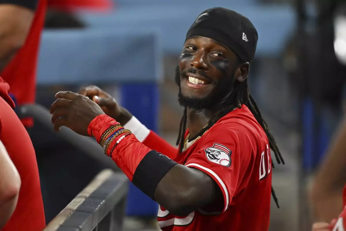 Cincinnati Reds shortstop Elly De La Cruz jokes in the dugout during the fourth inning of a baseball game against the Los Angeles Dodgers Monday, Aug. 25, 2025, in Los Angeles. (AP Photo/Jayne Kamin-Oncea)