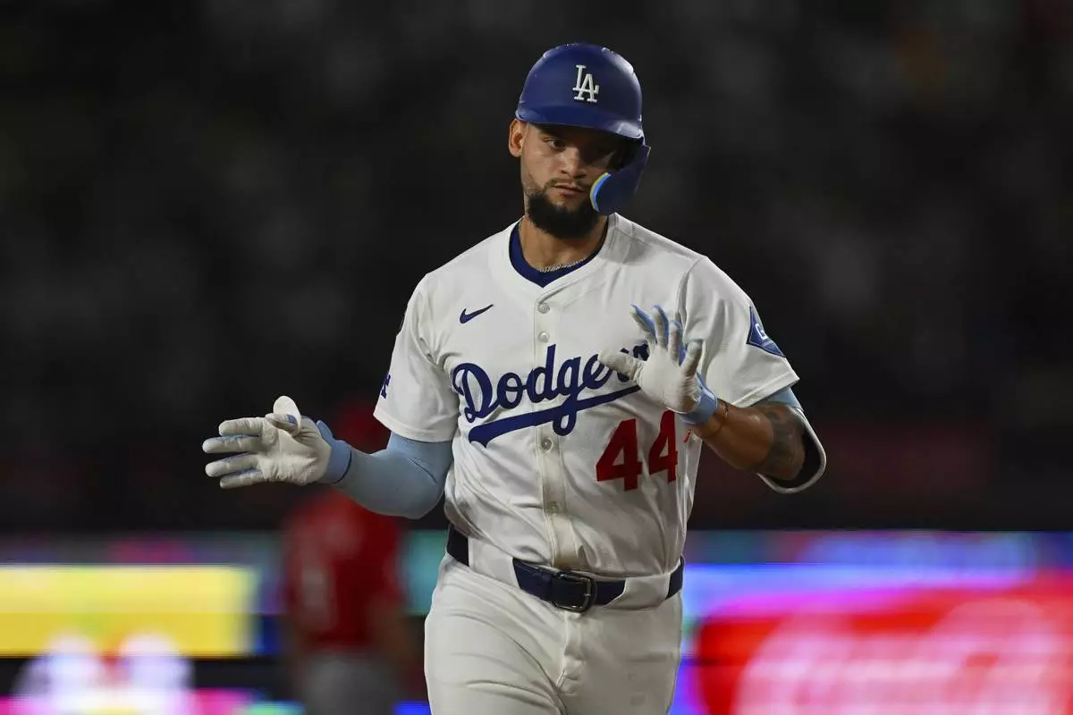 Los Angeles Dodgers' Andy Pages celebrates after hitting a home run during the third inning of a baseball game against the Cincinnati Reds Monday, Aug. 25, 2025, in Los Angeles. (AP Photo/Jayne Kamin-Oncea)