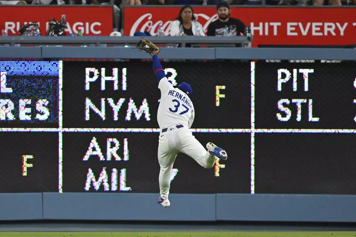 Los Angeles Dodgers right fielder Teoscar Hernandez makes the catch at the wall for the out on Cincinnati Reds' Jose Trevino during the third inning of a baseball game Monday, Aug. 25, 2025, in Los Angeles. (AP Photo/Jayne Kamin-Oncea)