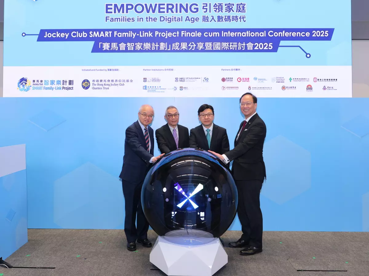 An opening ceremony for the Jockey Club SMART Family-Link Project Finale cum International Conference 2025 was held today, officiated by Chris Sun, Secretary for Labour and Welfare of the HKSAR Government; Jackson Woo, Steward of The Hong Kong Jockey Club; Professor Alexander Wai, President and Vice-Chancellor of Hong Kong Baptist University; and Professor Yang Wang, Vice-President and Pro-ViceChancellor (Institutional Advancement) of The University of Hong Kong.