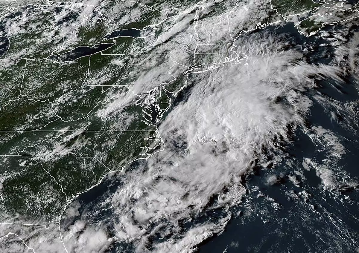 This satellite image proved by the National Oceanic and Atmospheric Administration (NOAA) shows Tropical Storm Fernand in the Atlantic off the east coast of the U.S. on Sunday, Aug. 24, 2025. (NOAA via AP)