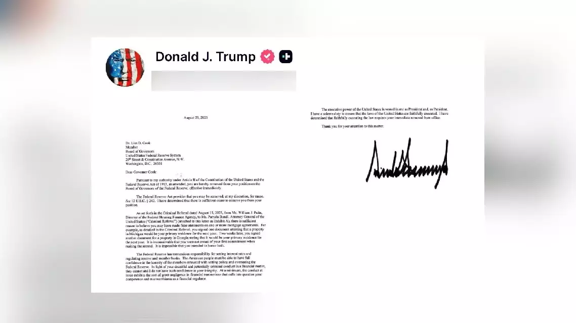 "Pursuant to my authority under Article II of the Constitution of the United States and the Federal Reserve Act of 1913, as amended, you are hereby removed from your position on the Board of Governors of the Federal Reserve, effective immediately," Trump wrote in a letter to Cook, posted on his Truth Social platform Monday.