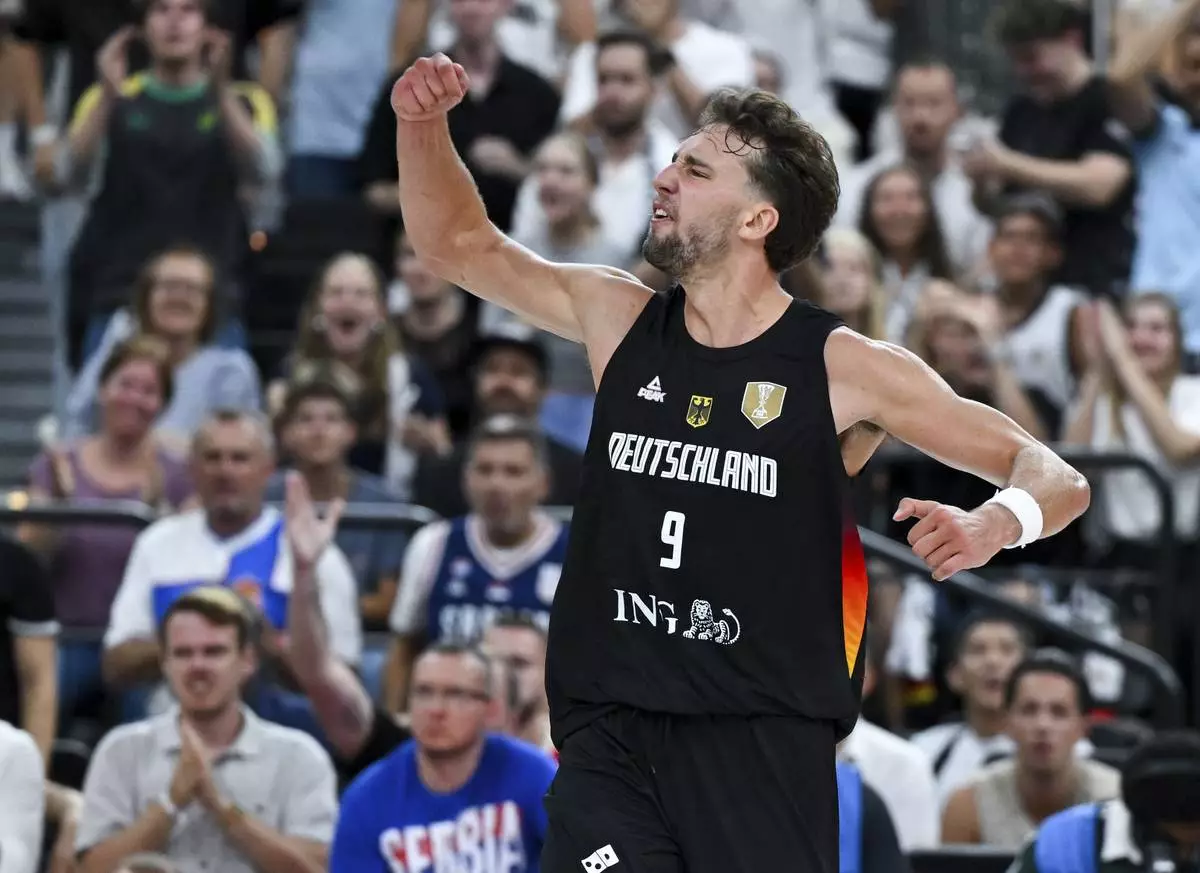 Germany's Franz Wagner reacts during the final of the Supercup basketball tournament against Serbia, Saturday, Aug. 16, 2025, in Munich, Germany. (Sven Hoppe/dpa via AP)