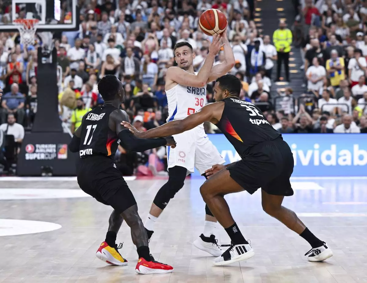 Germanys' Dennis Schröder, left,and Johannes Thiemann, right double team Serbia's Aleksa Avramovic during the final of the Supercup basketball tournament, Saturday, Aug. 16, 2025, in Munich, Germany. (Sven Hoppe/dpa via AP)