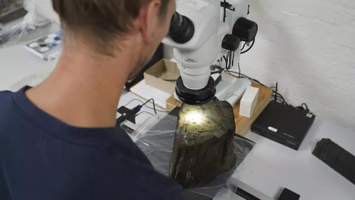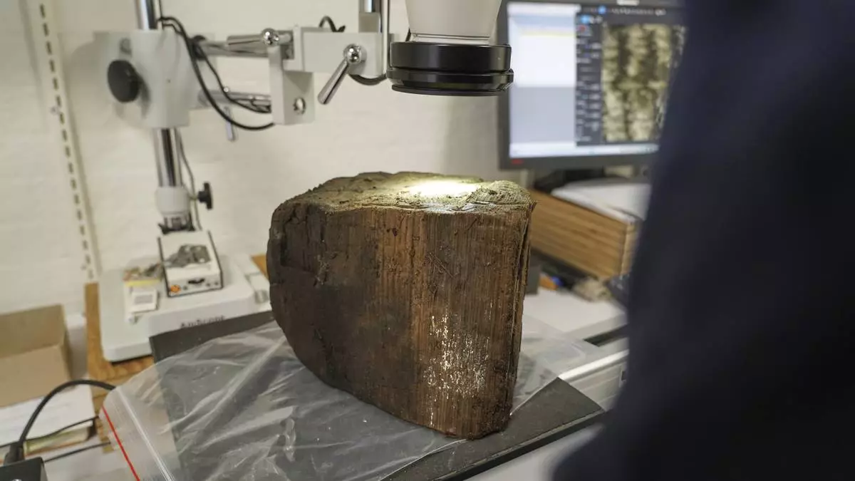 Dendrochronologist Jonas Ogdal Jensen looks at a suspected Stone Age tree trunk, unearthed at an 8,500-year-old coastal settlement submerged in his lab at Moesgaard Museum in Aarhus, Denmark. Aug.18, 2025. (AP Photo/James Brooks)