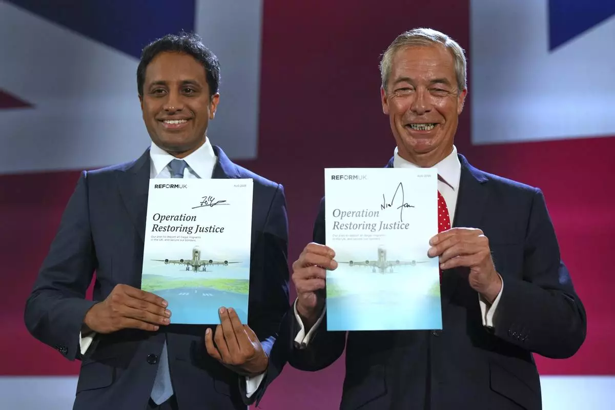 British Reform party leader Nigel Farage and Zia Yusuf, left, show the program Operation Restoring Justice during a press conference in a hangar at Oxford Airport in Kidlington, England, Tuesday, Aug. 26, 2025.(AP Photo/Joanna Chan)