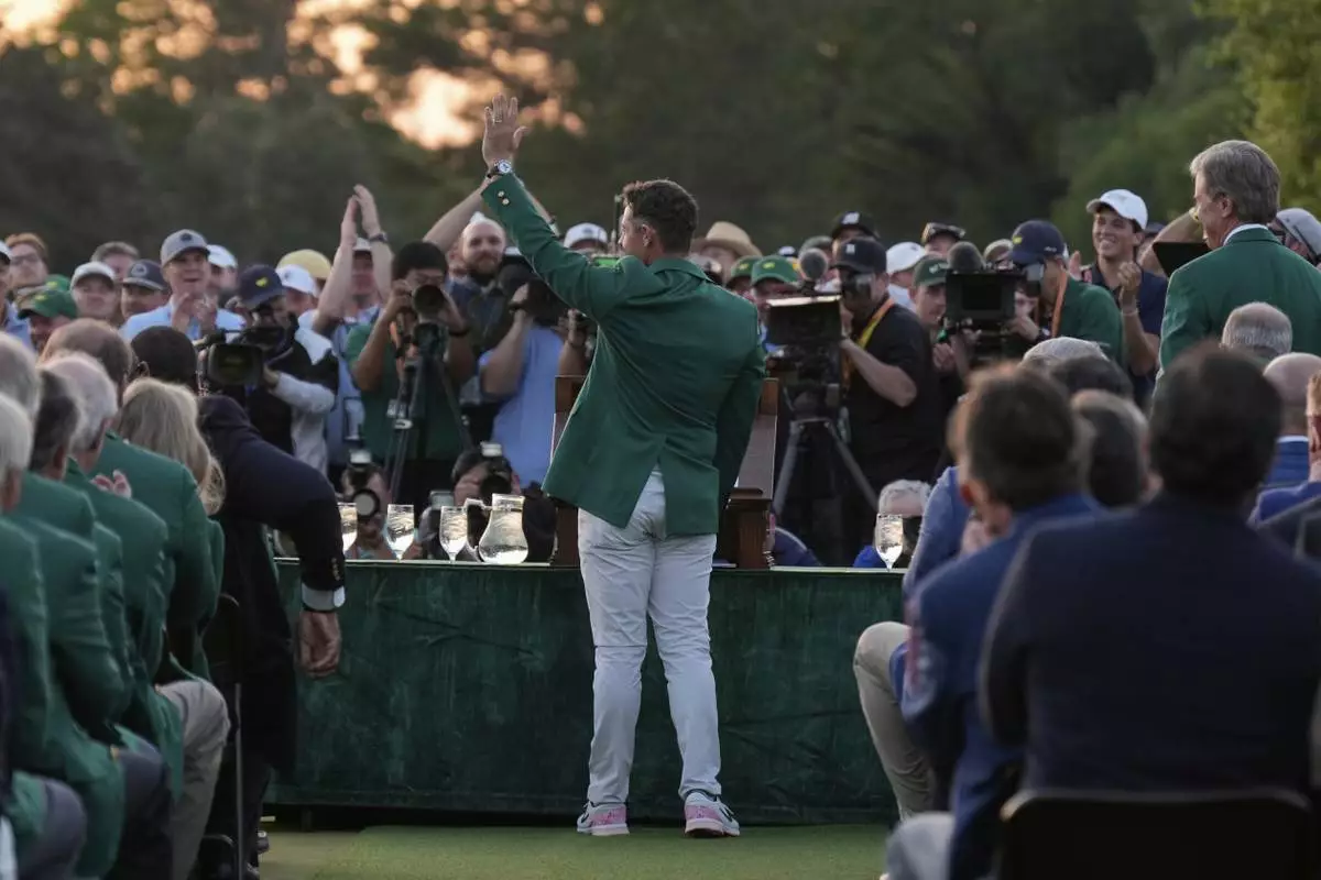 FILE - Winner Rory McIlroy, of Northern Ireland, celebrates while wearing the green jacket at the Masters golf tournament, Sunday, April 13, 2025, in Augusta, Ga. (AP Photo/George Walker IV, File)