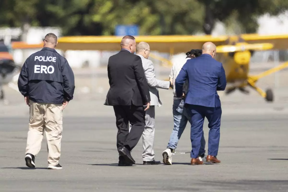 Harjinder Singh is escorted to an airplane by Florida Lt. Gov. Jay Collins and law enforcement on Thursday, Aug. 21, 2025, in Stockton, Calif. (AP Photo/Benjamin Fanjoy)