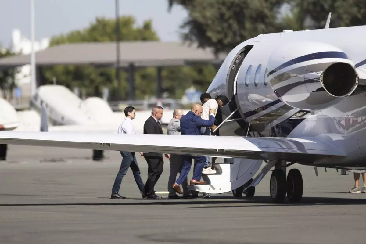 Harjinder Singh is escorted onto an airplane by Florida Lt. Gov. Jay Collins and law enforcement on Thursday, Aug. 21, 2025, in Stockton, Calif. (AP Photo/Benjamin Fanjoy)