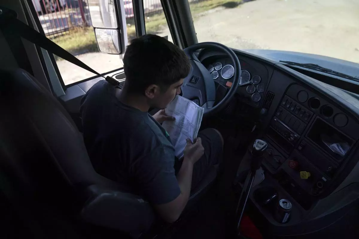 FILE - Student driver Edgar Lopez, 23, prepares for a practice driving session at California Truck Driving Academy in Inglewood, Calif., Monday, Nov. 15, 2021. (AP Photo/Jae C. Hong), File)