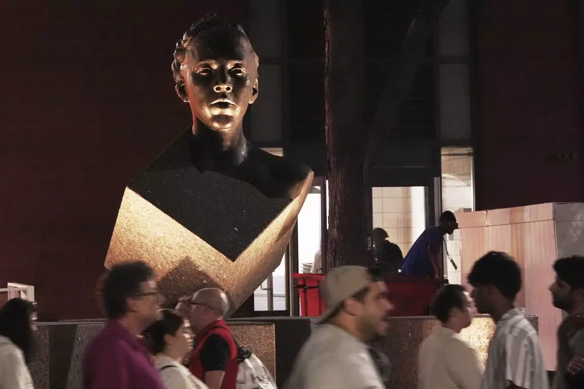 People walk in front of the Althea Gibson statue outside of Arthur Ashe Stadium during the first-round of the U.S. Open tennis championships, Sunday, Aug. 24, 2025, in New York. (AP Photo/Frank Franklin II)