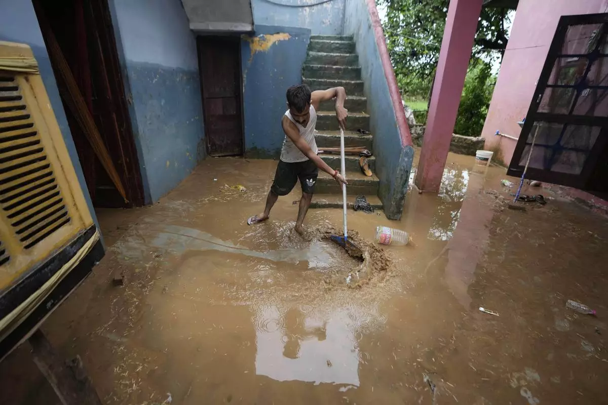 A man removes mud from his home after it was hit by flash floods on the outskirts of Jammu, India, Sunday, Aug. 24, 2025. (AP Photo/Channi Anand)
