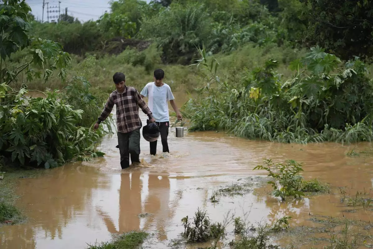 Indian boys wade through a waterlogged street after flash floods hit the outskirts of Jammu, India, Sunday, Aug. 24, 2025.(AP Photo/Channi Anand)