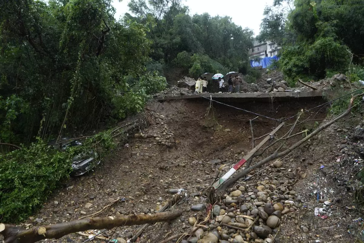 People look at the remains of a road damaged by flash floods in Jammu, India, Wednesday, Aug. 27, 2025. (AP Photo/Channi Anand)
