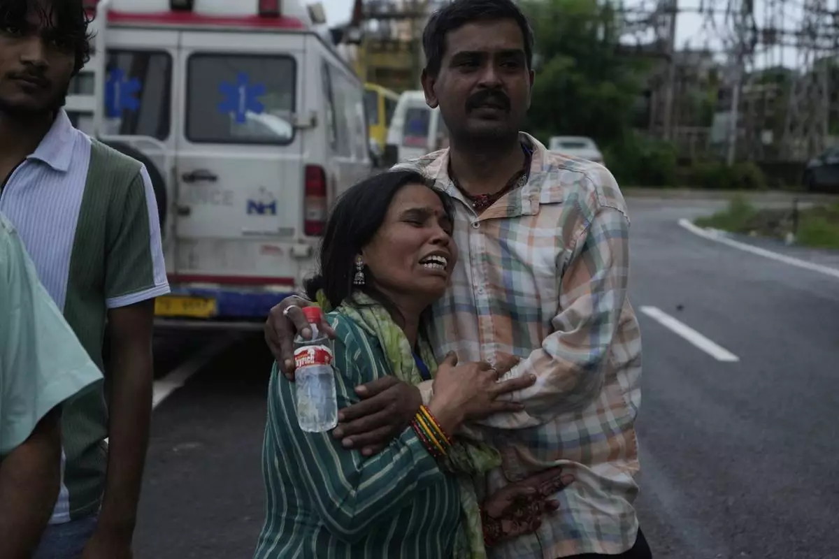 A pilgrim couple mourns the death of family members following a landslide due to floods on the route to the Shri Mata Vaishno Devi Temple, at the Government Medical Hospital in Jammu, India, Wednesday, Aug. 27, 2025. (AP Photo/Channi Anand)