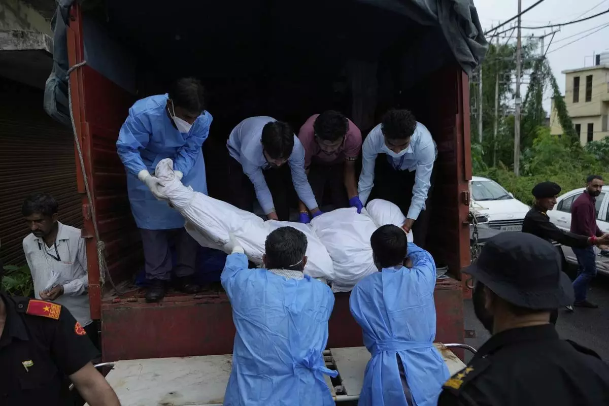Health workers carry the body of a pilgrim who died in a landslide due to floods on the route to the Shri Mata Vaishno Devi Temple, being shifted to the Government Medical Hospital in Jammu, India, Wednesday, Aug. 27, 2025.(AP Photo/Channi Anand)