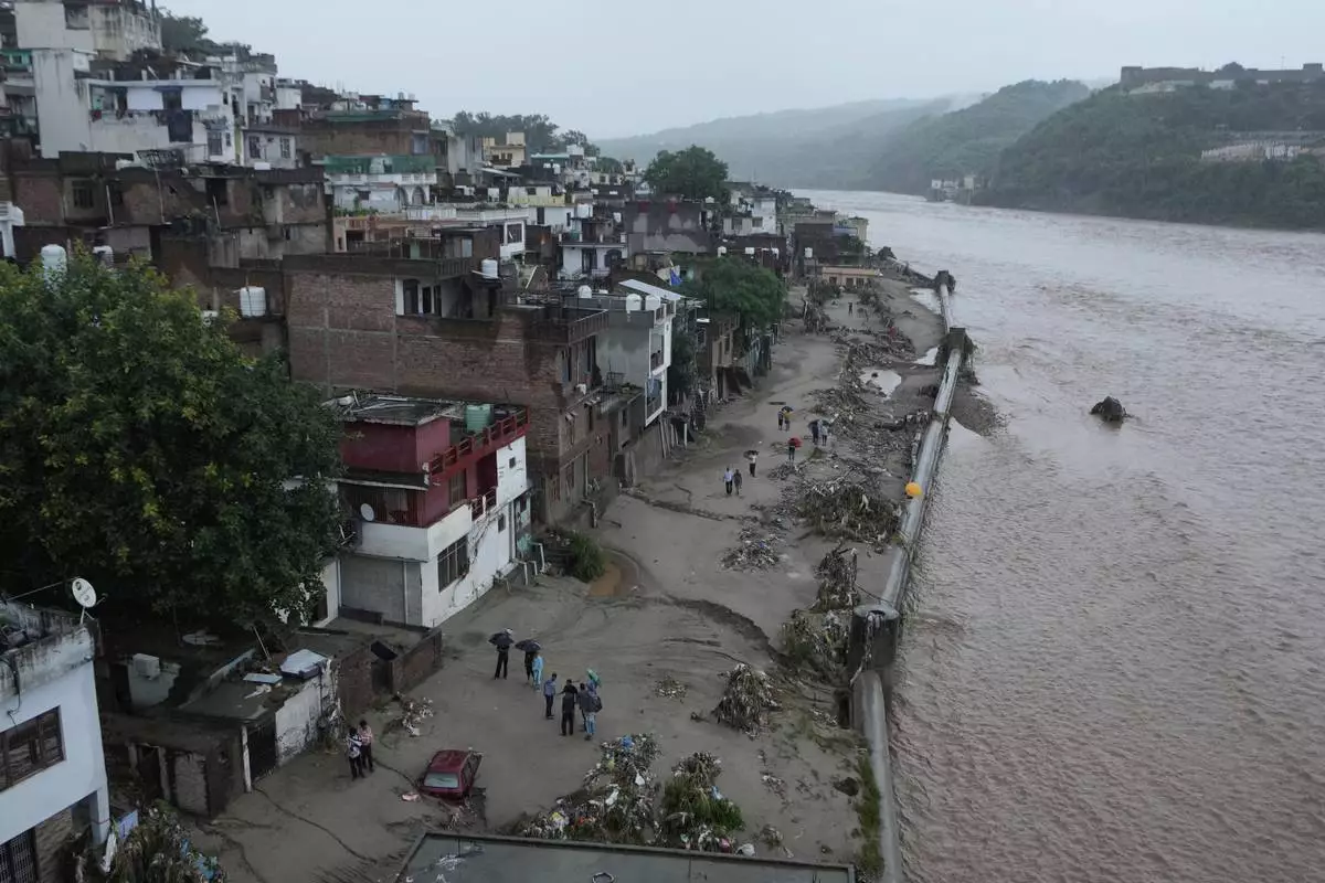 Residents look at the remains of their houses, damaged by flash floods at the banks of Tawi river in Jammu, India, Wednesday, Aug. 27, 2025. (AP Photo/Channi Anand)