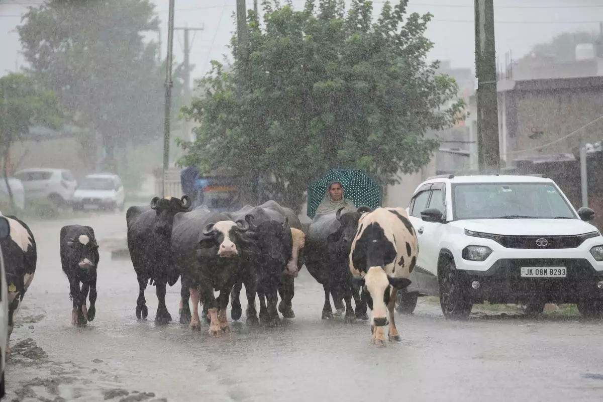A woman, along with her cattle, moves to a safer place after heavy rain caused flooding near the banks of the Tawi River in Jammu, India, Tuesday, Aug. 26, 2025. (AP Photo/Channi Anand)