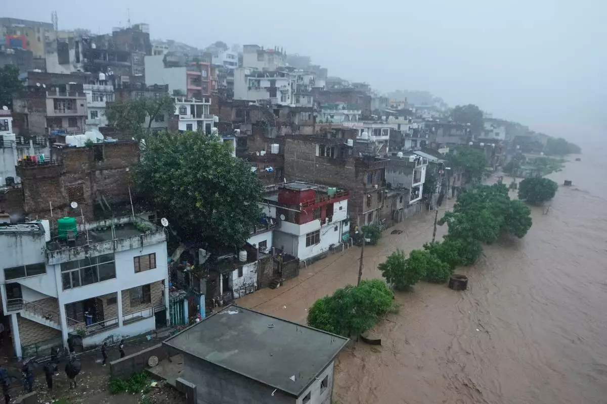 People watch a swelling River Tawi from the roof of their houses in Jammu, India, Tuesday, Aug 26, 2025.(AP Photo/Channi Anand)