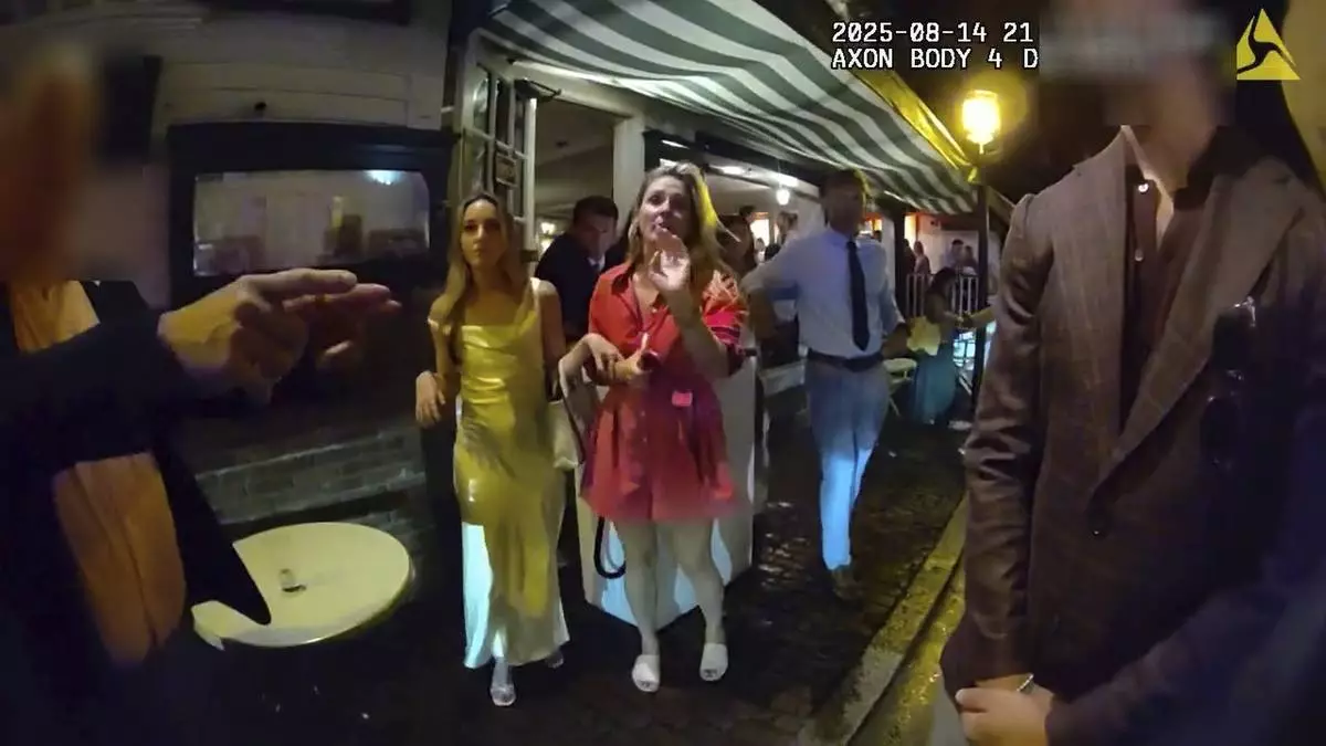 In an image taken from police body camera footage, Newport Police officers interact with Rhode Island Special Assistant Attorney General Devon Flanagan, in red, and her companions after restaurant representatives indicated that they did not want them on their premises, an encounter that ended with officers detaining Flanagan on trespassing charges, Aug. 14, 2025, in Newport, R.I. (Newport Police Department via AP)