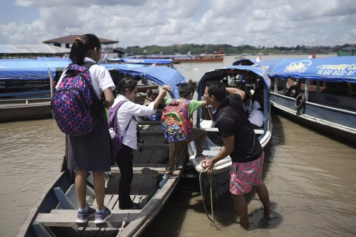 Salvador Mitidieri helps schoolchildren board his boat after classes in Santa Rosa, Peru, Monday, Aug. 18, 2025. (AP Photo/Ivan Valencia)