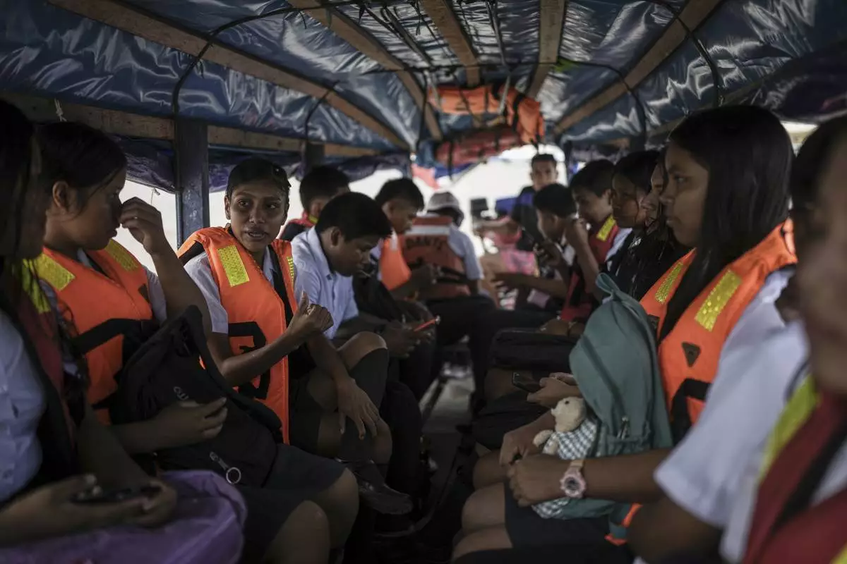Students board Salvador Mitidieri's boat in Tabatinga, Brazil, to commute to school in Santa Rosa, Peru, Monday, Aug. 18, 2025. (AP Photo/Ivan Valencia)