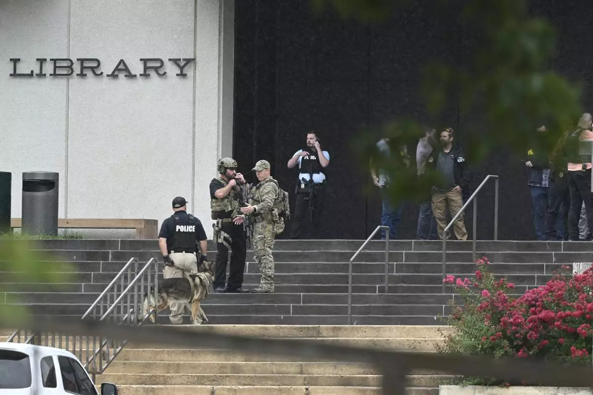 Law enforcement officers gather in front of the library on the University of Arkansas campus while responding to reports of a shooting Monday, Aug. 25, 2025, in Fayetteville, Ark. (AP Photo/Michael Woods)