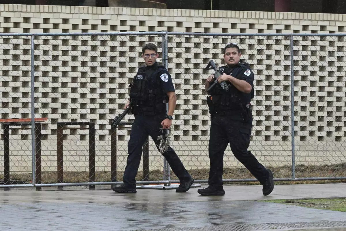 Law enforcement officers respond to reports of a shooting on the University of Arkansas campus Monday, Aug. 25, 2025, in Fayetteville, Ark. (AP Photo/Michael Woods)