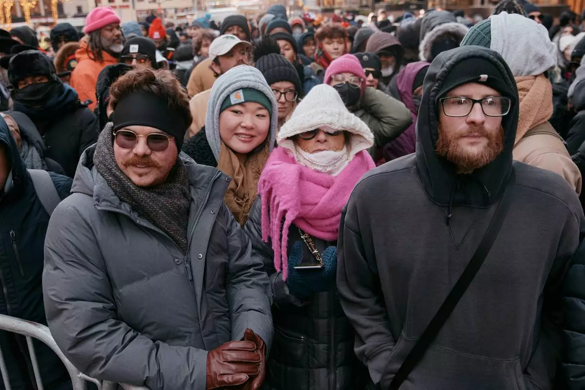 People wait in the cold near City Hall before Zohran Mamdani's inauguration as mayor on Thursday, Jan. 1, 2026, in New York. (AP Photo/Andres Kudacki)