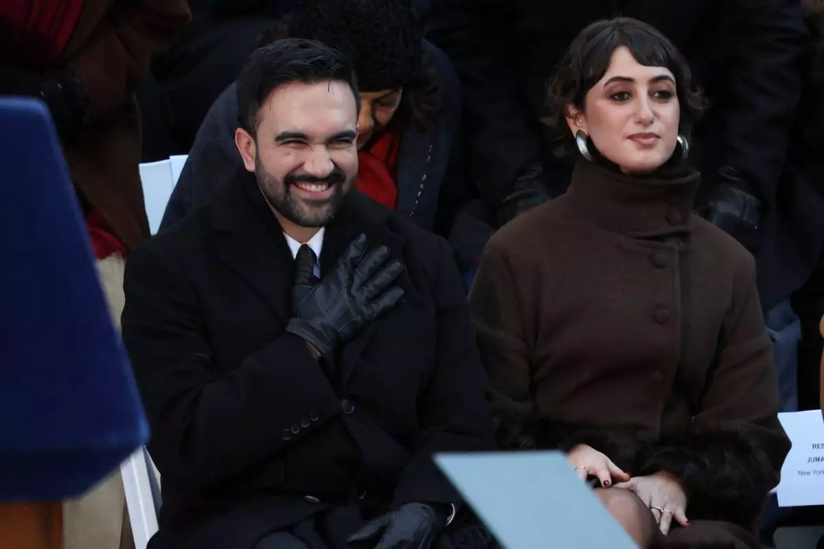Mayor-elect Zohran Mamdani, center, arrives with his wife Rama Duwaji for a swearing-in ceremony, Wednesday, Dec. 31, 2025, in New York. (Amir Hamja/The New York Times via AP, Pool)