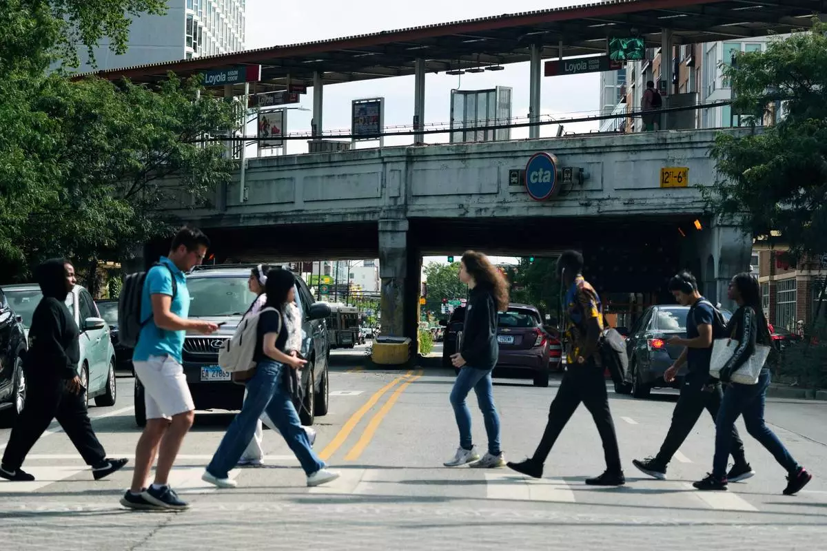 Pedestrians cross a street in front of a CTA station in Chicago, Tuesday, Aug. 26, 2025. (AP Photo/Nam Y. Huh)