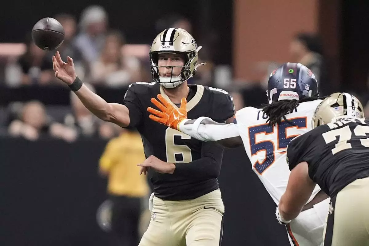 New Orleans Saints quarterback Tyler Shough, left, passes the ball under pressure from Denver Broncos linebacker Jordan Turner in the second half of an NFL preseason football game Saturday, Aug. 23, 2025, in New Orleans. (AP Photo/Gerald Herbert)