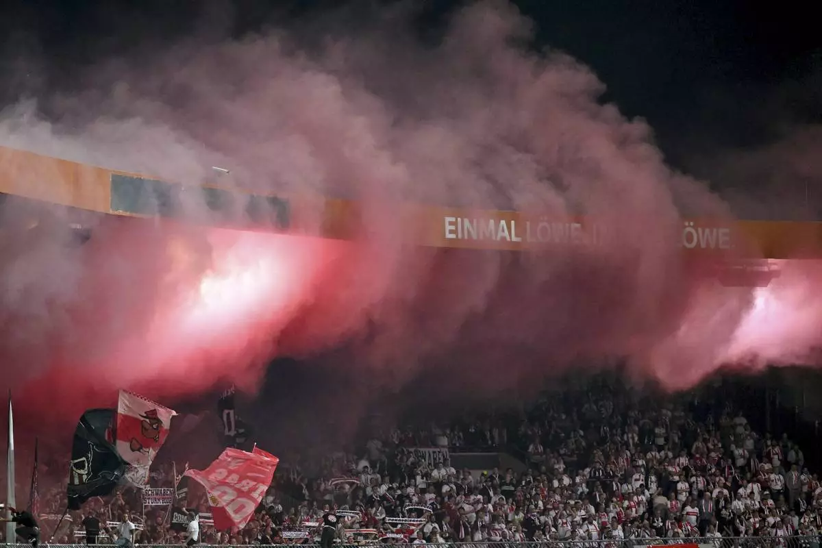 Fans set off pyrotechnics during a DFB Pokal, German Cup, soccer match between VfB Stuttgart and Eintracht Braunschweig, Tuesday, Aug. 26, 2205, in Brunswick, Germany. (Swen Pförtner/dpa via AP)