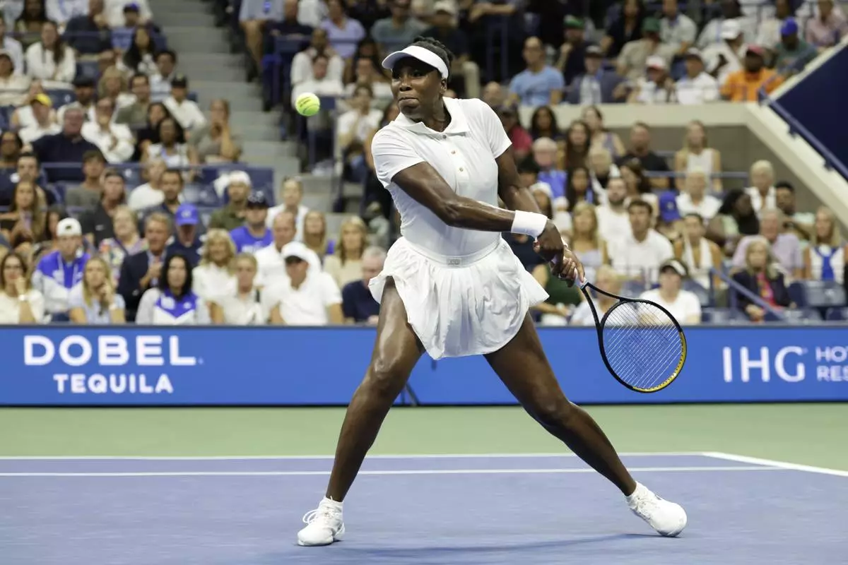 Venus Williams, of the United States, returns a shot to Karolina Muchova, of the Czech Republic, during the first round of the U.S. Open tennis championships, Monday, Aug. 25, 2025, in New York. (AP Photo/Adam Hunger)