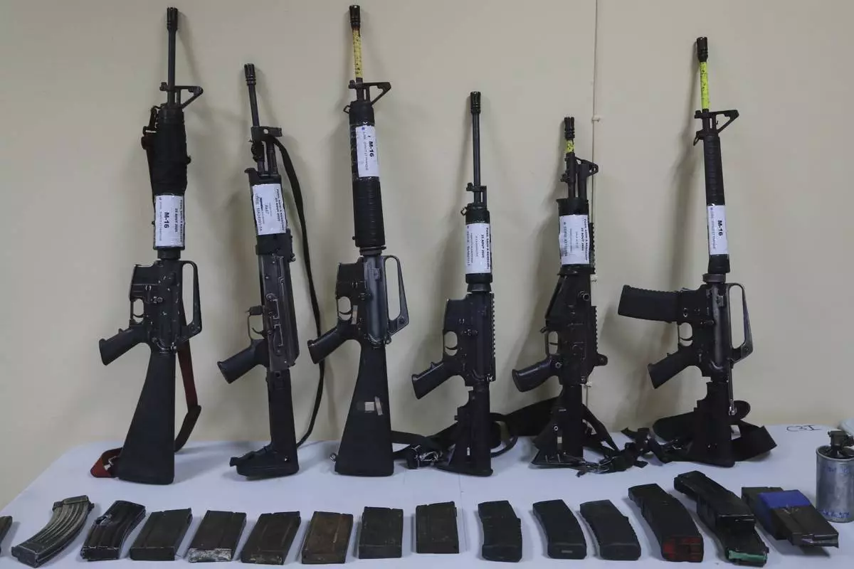 Weapons that police say were seized from alleged gang members sit on display for the media during a press conference at police headquarters in Port-au-Prince, Haiti, Tuesday, Aug. 26, 2025.(AP Photo/Odelyn Joseph)
