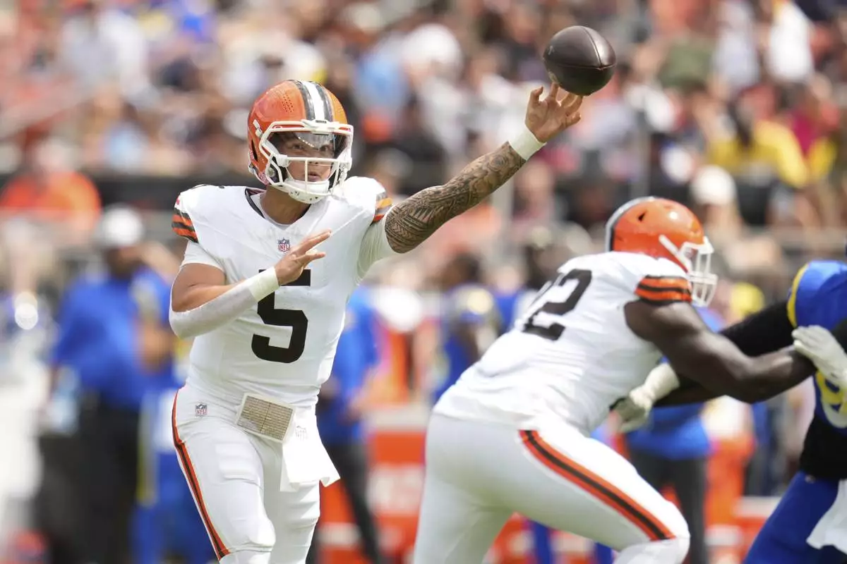 Cleveland Browns quarterback Dillon Gabriel (5) throws a pass during the first half of an NFL preseason football game against the Los Angeles Rams, Saturday, Aug. 23, 2025, in Cleveland. (AP Photo/Sue Ogrocki)