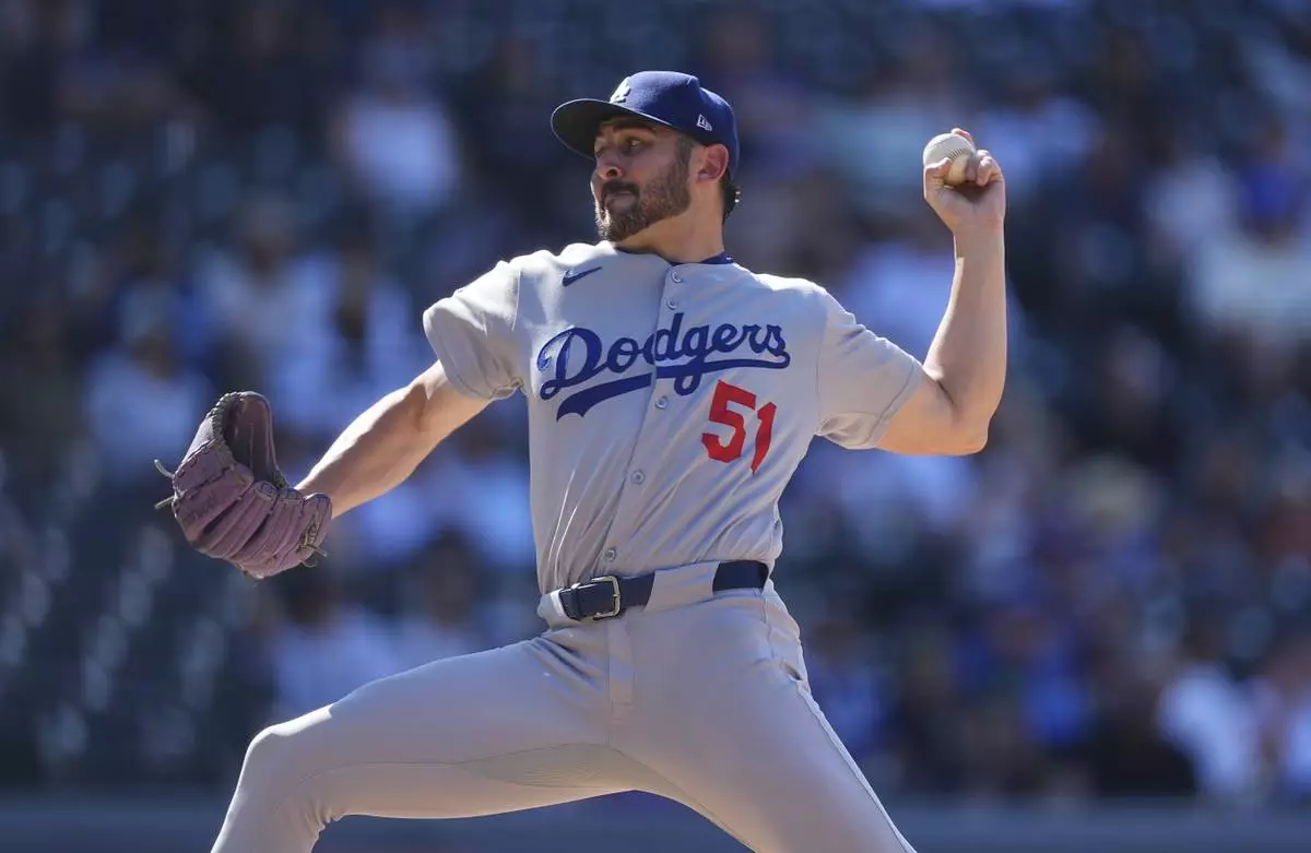Los Angeles Dodgers relief pitcher Alex Vesia works against the Colorado Rockies in the ninth inning of a baseball game Thursday, Aug. 21, 2025, in Denver. (AP Photo/David Zalubowski)