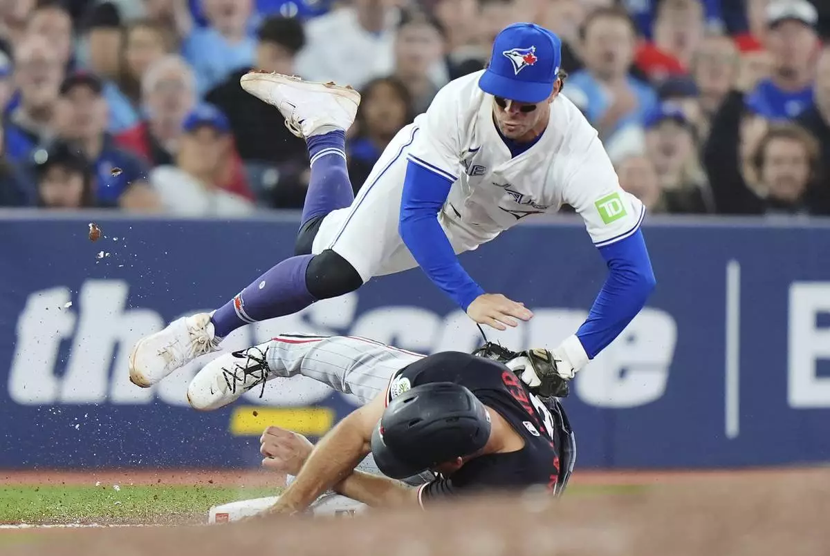 Toronto Blue Jays third baseman Ernie Clement (top) tags out Minnesota Twins' Matt Wallner (38) at third base during eighth inning MLB baseball action in Toronto on Tuesday, August 26, 2025. (Frank Gunn/The Canadian Press via AP)