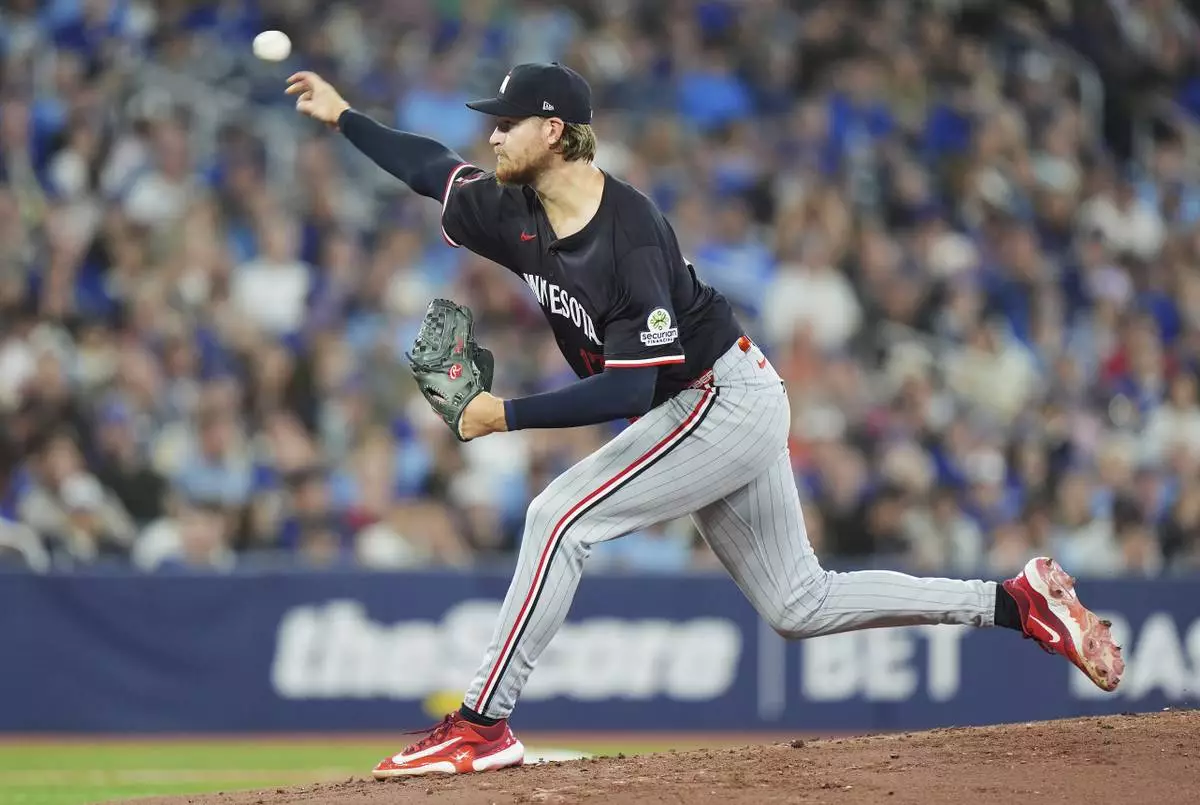 Minnesota Twins pitcher Bailey Ober works against the Toronto Blue Jays during the first inning of a baseball game in Toronto on Tuesday, Aug. 26, 2025. (Frank Gunn/The Canadian Press via AP)