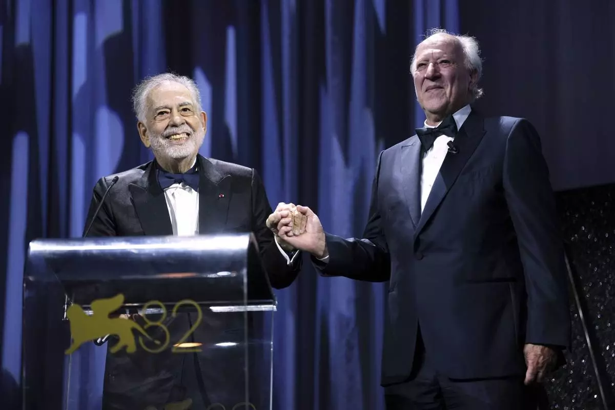 Francis Ford Coppola, left, presents the Golden Lion for lifetime achievement to Werner Herzog during the opening ceremony and the premiere of the film 'La Grazia' during the 82nd edition of the Venice Film Festival in Venice, Italy, on Wednesday, Aug. 27, 2025. (Photo by Scott A Garfitt/Invision/AP)