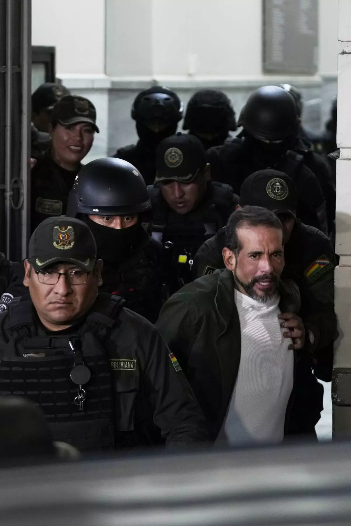 Suspended governor of Santa Cruz Luis Fernando Camacho is escorted by police out of court after a hearing on his arrest over charges of sedition and terrorism, in La Paz, Bolivia, Tuesday, Aug. 26, 2025. (AP Photo/Juan Karita)