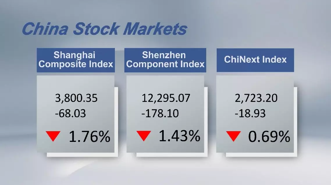 Chinese stocks closed lower on Wednesday, with the benchmark Shanghai Composite Index down 1.76 percent to 3,800.35 points. The Shenzhen Component Index closed 1.43 percent lower at 12,295.07 points. The ChiNext Index, tracking China's Nasdaq-style board of growth enterprises, lost 0.69 percent to close at 2,723.20 points Wednesday.