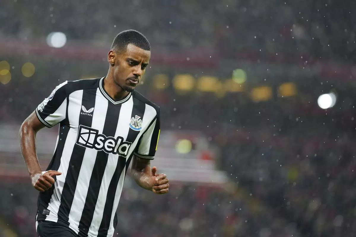 FILE - Newcastle's Alexander Isak celebrates after scoring his side's opening goal during the English Premier League soccer match between Liverpool and Newcastle, at Anfield stadium in Liverpool, England, Monday, Jan. 1, 2024. (AP Photo/Jon Super, File)