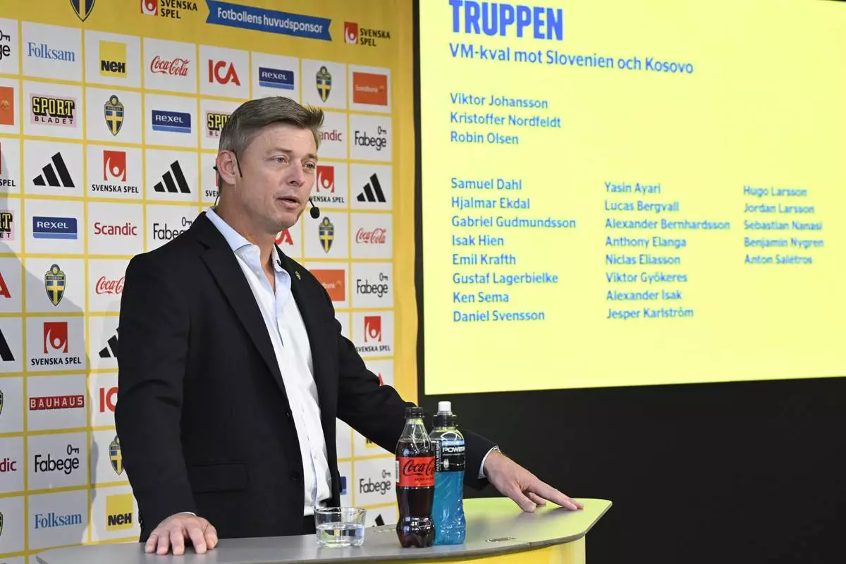 Sweden coach Jon Dahl Tomasson speaks during a news conference announcing the squad for the upcoming FIFA World Cup soccer qualifiers, Wednesday, Aug. 27, 2025. (Henrik Montgomery/TT News Agency via AP)