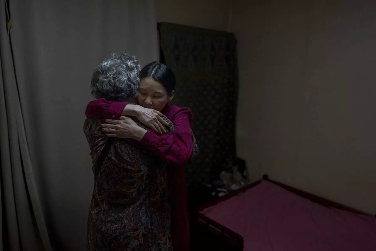 FILE - Truth and Reconciliation Commission Chairperson Park Sun Young, right, comforts adoptee Yooree Kim during a press conference in Seoul, South Korea, March 26, 2025. (AP Photo/Ahn Young-joon, File)