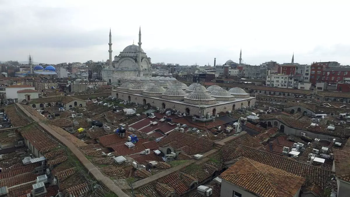 FILE - Aerial photo taken with a drone shows the roof of Istanbul's centuries-old Grand Bazaar, foreground, Feb. 1, 2016. (Ali Aksoyer/DHA via AP, File)