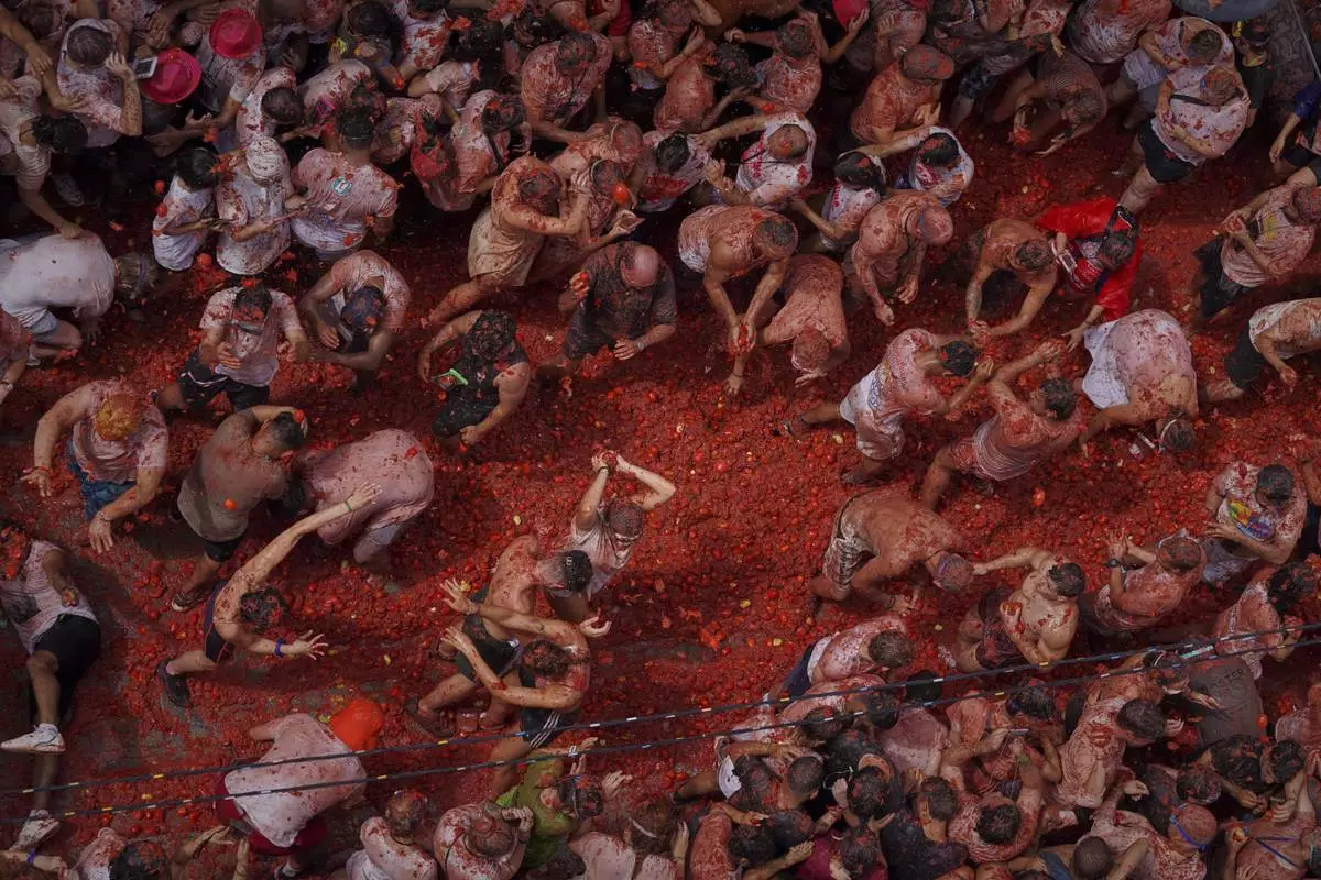 The mother of all food fights painted a packed central street in the eastern town of Buñol deep red as revelers squished, smashed and hurled 120 tons of the overripe fruit. Tarps covered building fronts as an estimated 20,000 people let loose amid screams and laughter.