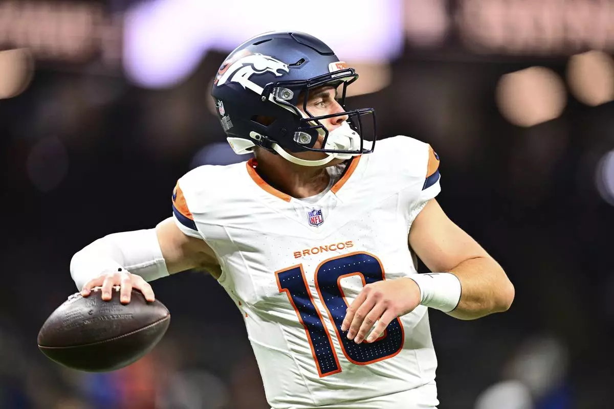 Denver Broncos quarterback Bo Nix warms up before facing the New Orleans Saints in an NFL preseason football game Saturday, Aug. 23, 2025, in New Orleans. (AP Photo/Ella Hall)