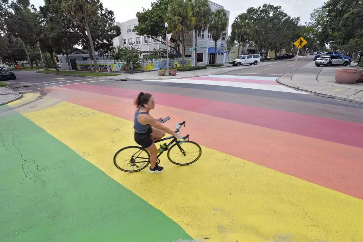 A cyclist crosses a rainbow-painted street mural Wednesday, Aug. 27, 2025, in St. Petersburg, Fla. (AP Photo/Chris O'Meara)