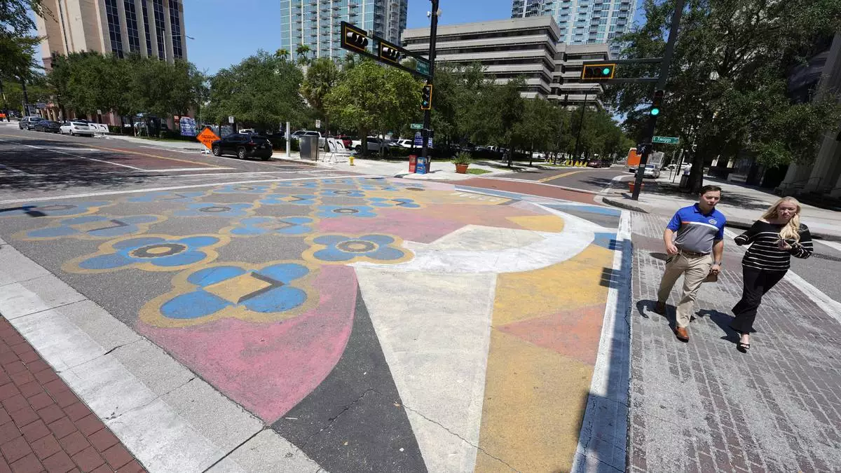 People walk past a street mural Wednesday, Aug. 27, 2025, in downtown Tampa, Fla. (AP Photo/Chris O'Meara)